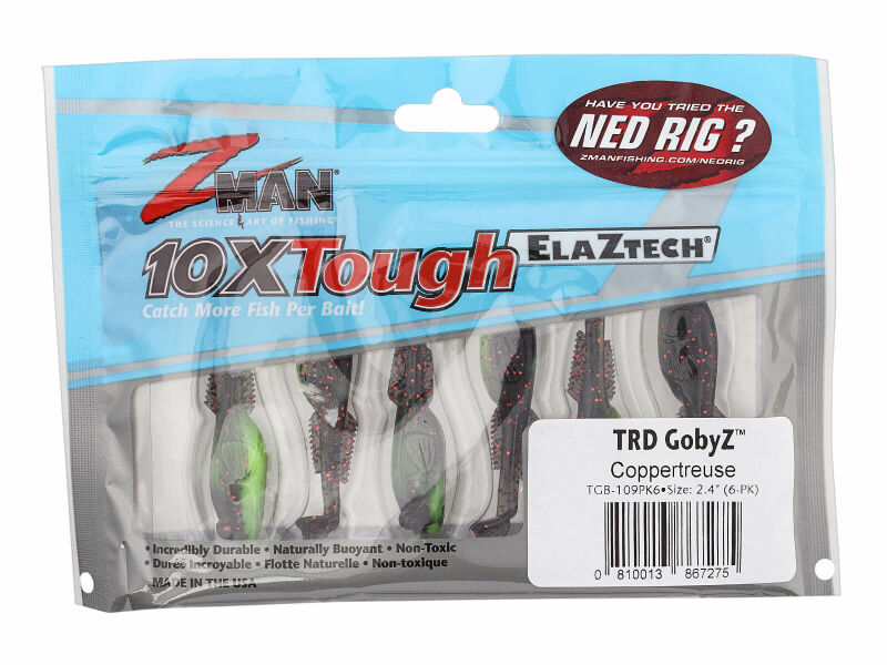 Die 2.4″ TRD GobyZ von Z-Man sind perfekte kleine Grundel-Imitationen, um damit auf Barsch, Zander und Forelle zu fischen. Der detaillierte Kopf mit den großen Augen, der typische rundliche, breite Körper sowie die Flossen sind nahezu perfekt einer kleinen Grundel nachempfunden. Der runde Schaufelschwanz spielt zuverlässig auch bei langsamer Führung. Während der Pausen am Grund richten sich die TRD GobyZ aufgrund des schwimmendes Materials auf und ähneln so einem am Grund fressenden Fischchen. Die 2.4″ TRD GobyZ sind perfekt für das Ned Rig und können am besten mit den entsprechenden Ned Jigs, wie den Finesse Shroomz gefischt werden.
